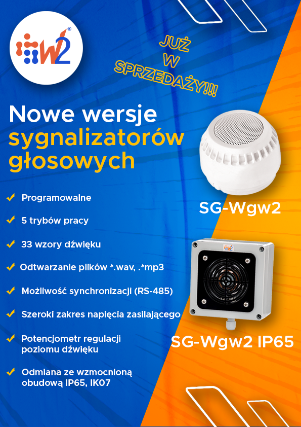 New versions of voice sounders have appeared in W2's offer SG-Wgw2 and SG-Wgw2 IP65. Thanks to their universality, the devices can be used for virtually any purpose. They are most often used in places where, in addition to an alarm signal, it is also necessary to generate a non-standard voice message. The alarms are perfect for use in burglary and intrusion detection systems, automation installations, technical facilities or even in stores.