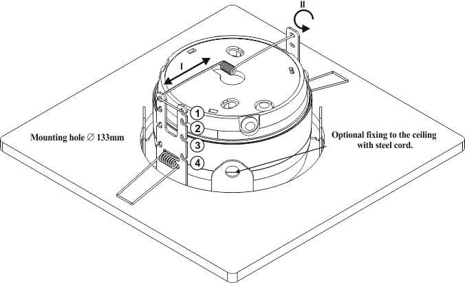 To install the mounting sleeve OM-2 cut a hole with a diameter of 133 mm (using a hole saw) in the suspended ceiling. Then remove the spring placed at the top part of the sleeve, and place the selected signaling device in the sleeve as shown on Figure 1. After placing the signaling device, the spring should be returned into place, at a height best suited for mounting the given alarm device. Pressing onto the side springs, insert the sleeve into the mounting hole .