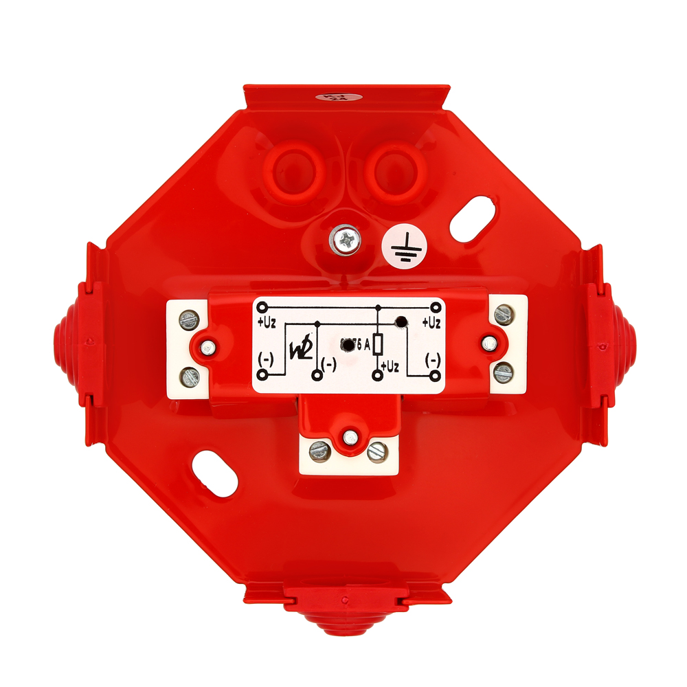 The PIP-1AN/0,375A box is made of sheet metal covered with red powder paint. There are special rivet nuts on the box cover that allow the W2 internal signaling device to be mounted directly on the box. There is also a hole in the box cover to allow the cable to be led out to the signaling device mounted on the cover. The side walls of the base have graduated chokes inserted from the top and made of flame-retardant material. Gradation allows you to adjust the hole to the required cable diameter (7-19 mm). Three ceramic cubes with 2 current paths (terminals) each are attached directly to the base of the box. Access to internal connections and the fuse is limited by a metal cover. There is an embossment under the ceramic cubes, which is intended to increase the mechanical strength of the box during a fire, as well as to equalize the height of the inserted cable with the terminals of the ceramic cubes. The box has separate terminals for connecting the signal line input, separate ones for connecting the signal line output and separate ones for connecting a signalling or other device via a fuse (90° branching). The base of the box also has a place for grounding connection, mounting holes and chokes made of flame-retardant material enabling the introduction of cables (10 mm) from the ground side.
