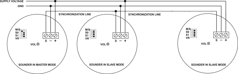 Synchronization of signalling devices takes place with use of additional line (S terminal of signalling device). During creation of synchronously operating networks one should remember about proper configuration of signalling devices operating mode (only one master device, the remaining signaling devices operate in slave mode).