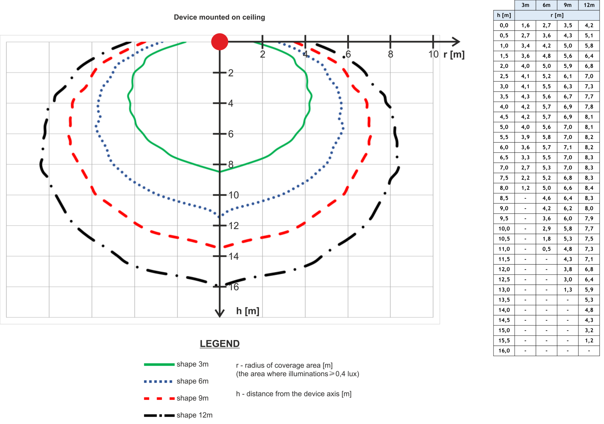 In [1], the division according to the coverage category has been characterized. For category C signaling devices, the manufacturer must specify the maximum mounting height: 3 m, 6 m or 9 m and the diameter (in meters) of the cylindrical area that is the operating range of the device installed at ceiling height, where the signaling device achieves the required light intensity. For example, the designation C-3-6 means that the VAD mounted at a height of 3 m provides the required light intensity in a cylinder with a diameter of 6 m and a height of 3 m.