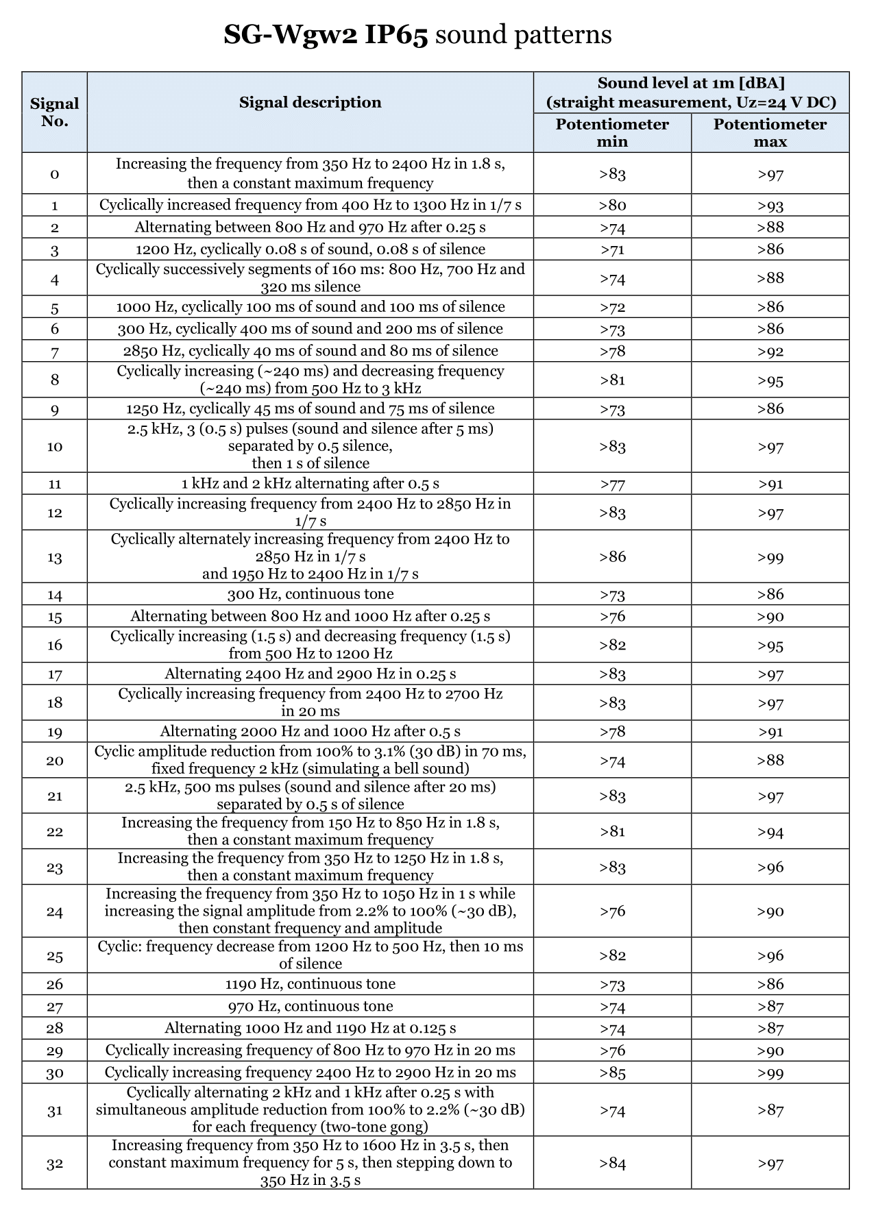 The SG-Wgw2 IP65 voice sounder offers the user the ability to play up to six voice messages (depending on the configuration) with an acoustic warning signal (1 out of 33 sound patterns). The programming of the sequences is carried out independently. The user can define: the pattern of the acoustic warning signal, pause 1, voice message, pause 2.