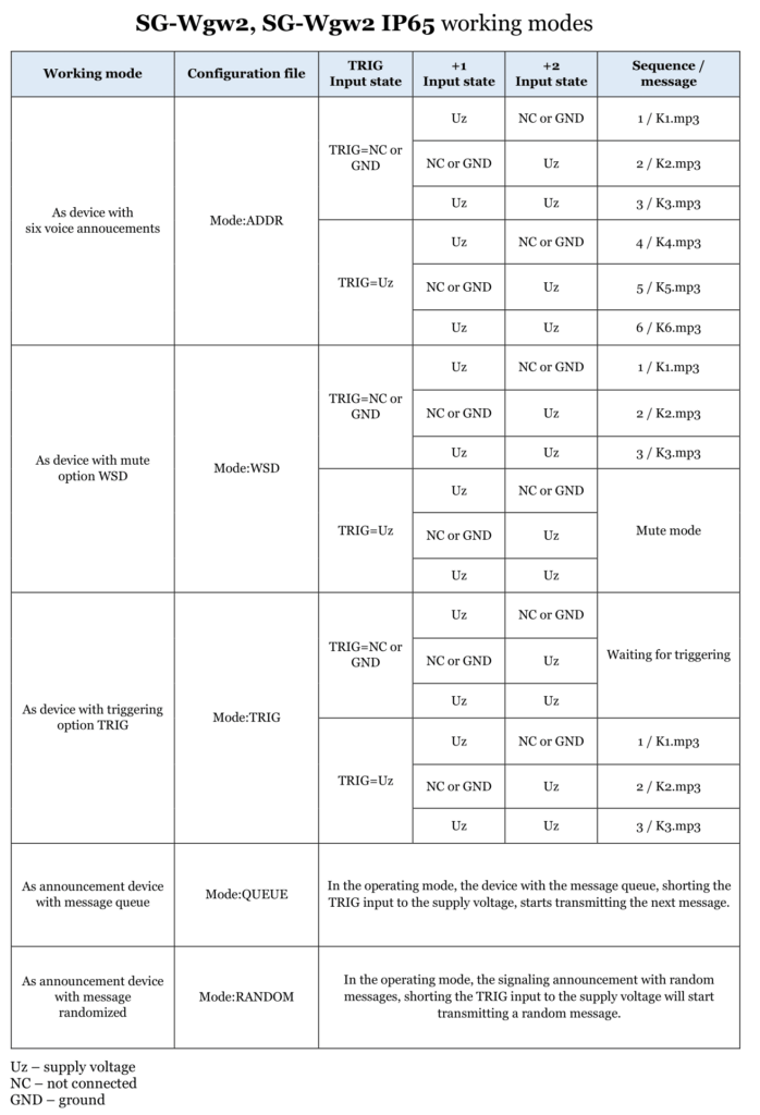 The voice sounder plays *.mp3 files. The selection of the file to be played consists of supplying power to the appropriate siren connectors (+1, +2, TRIG), or depending on the operating mode, the messages are played sequentially or in random order. Files with messages to be played must always be named K1.mp3, K2.mp3… K6.mp3. If the configuration file does not contain the sequence description for a given state of inputs, the device will try to play the *.mp3 file whose name corresponds to the selected state of inputs. If the sequence has been defined, playback will start as described in the configuration file.