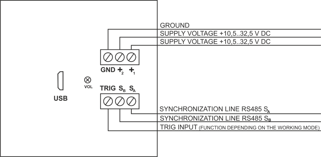 Connecting the supply voltage to the terminals triggers the generation of the appropriate alarm and the output signal according to the programmed settings.