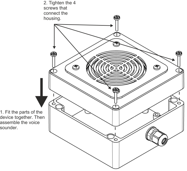 In order to close the device, fit the part with electronics and the part with the loudspeaker together, then assemble the signaling device. Tighten the 4 screws that connect the housing.