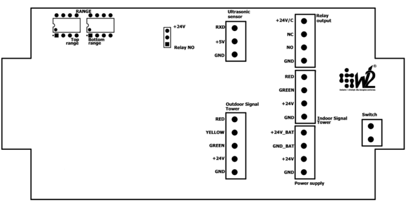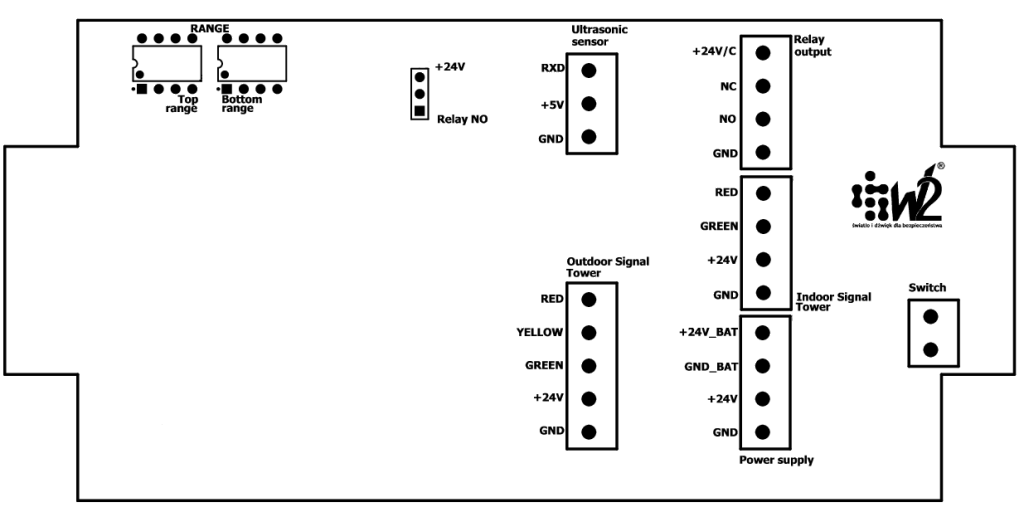 Moreover, if the distance of the vehicle from the sensor is equal to or smaller than the lower limit, the status at the transmitter output changes. With the use of the jumper mounted on a printed circuit board it is possible to select the output signal for the external control system. The system enables selection between 24 V DC signal and NC contact of the transmitter.