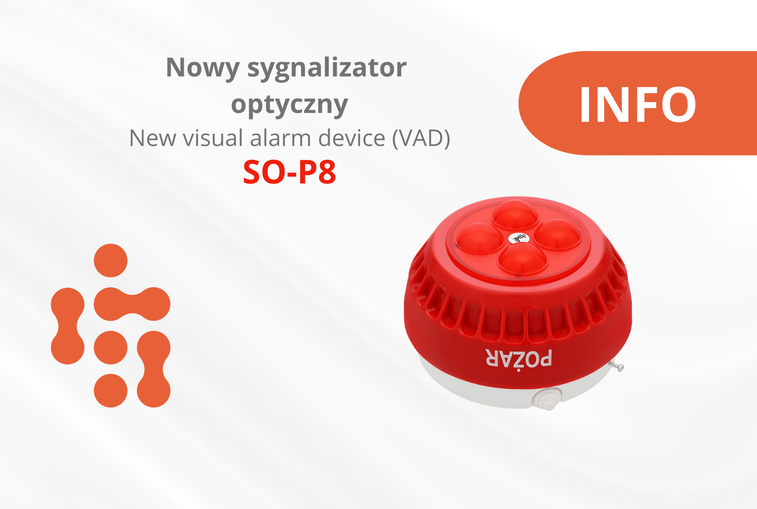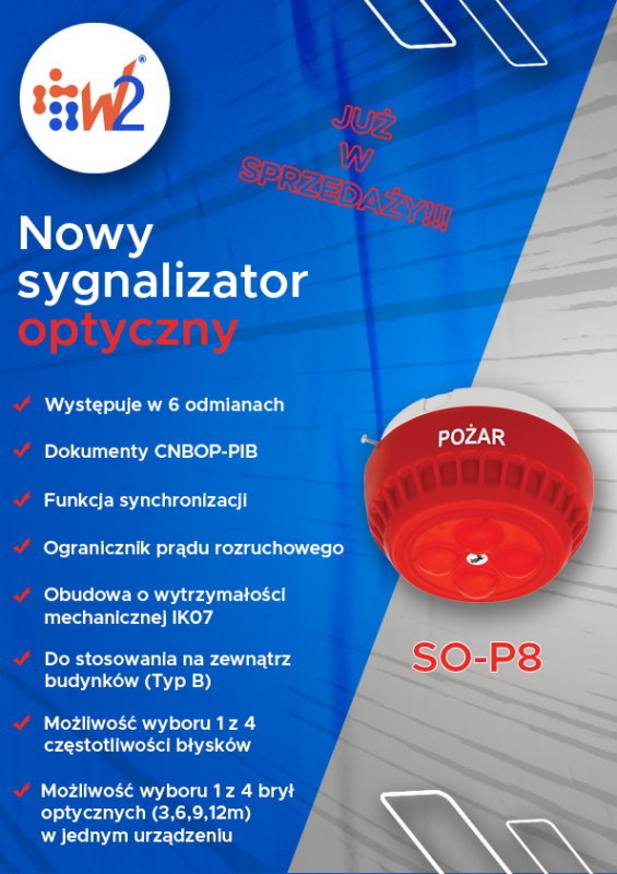 W ofercie pojawił się pożarowy sygnalizator optyczny SO-P8, który zastępuje produkowany od lat model SO-Pd13. Nowy optyk jest certyfikowany jako sygnalizator do pracy na zewnątrz budynków (Typ B). Może on z powodzeniem pracować w temperaturach od -25°C do +70°C. Występuje w 6 odmianach różniących się między sobą kolorem obudowy (biała lub czerwona), a także barwą generowanego światła (białe, czerwone, białe i czerwone naprzemiennie). Warto podkreślić, że Świadectwo Dopuszczenia jest ważne jedynie dla odmiany SO-P8/CC (obudowa i światło czerwone) podczas, gdy Certyfikat Stałości Właściwości Użytkowych obowiązuje dla wszystkich odmian.