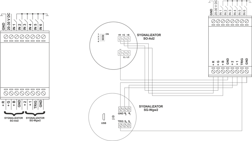 Rolą modułu jest pośredniczenie pomiędzy wyjściem przekaźnikowym maszyny a urządzeniami sygnalizacyjnymi. Do modułu można podłączyć maksymalnie sześć wyjść przekaźnikowych maszyny (rys. 1.1.). Rolą modułu jest sterowanie pracą sygnalizatorów SG-Wgw2 (SG-Wgw2 IP65) oraz SO-Ad2 w odpowiedzi na odpowiedni stan wyjść sterujących maszyny. Dzięki połączeniu tych dwóch sygnalizatorów użytkownik może tworzyć optyczne sygnały alarmowe połączone z odpowiednim komunikatem głosowym. Przykładowo w momencie, kiedy maszyna uaktywni wyjście przekaźnikowe, wygenerowany zostanie sygnał optyczny koloru czerwonego i komunikat głosowy „Uwaga ! Uwaga ! Awaria maszyny !”.