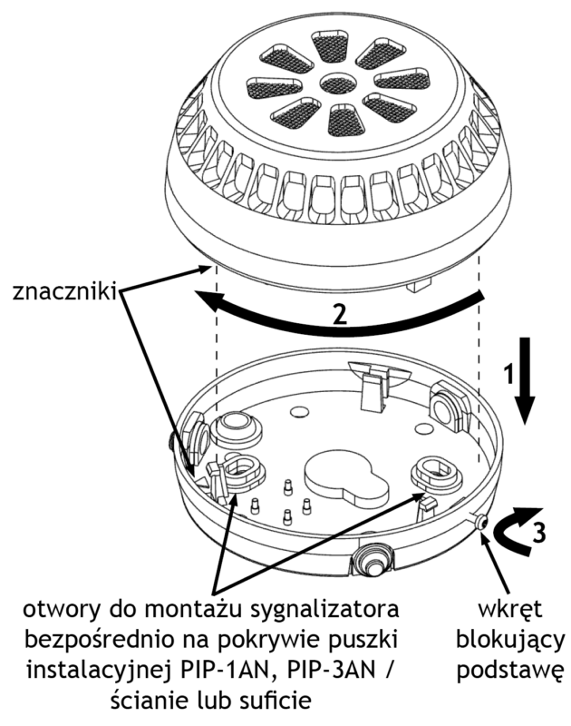 W celu zamknięcia sygnalizatora należy dopasować do siebie znaczniki, następnie złożyć sygnalizator oraz dokonać obrotu w kierunku zaznaczonym strzałką (kolejność na rysunku ).