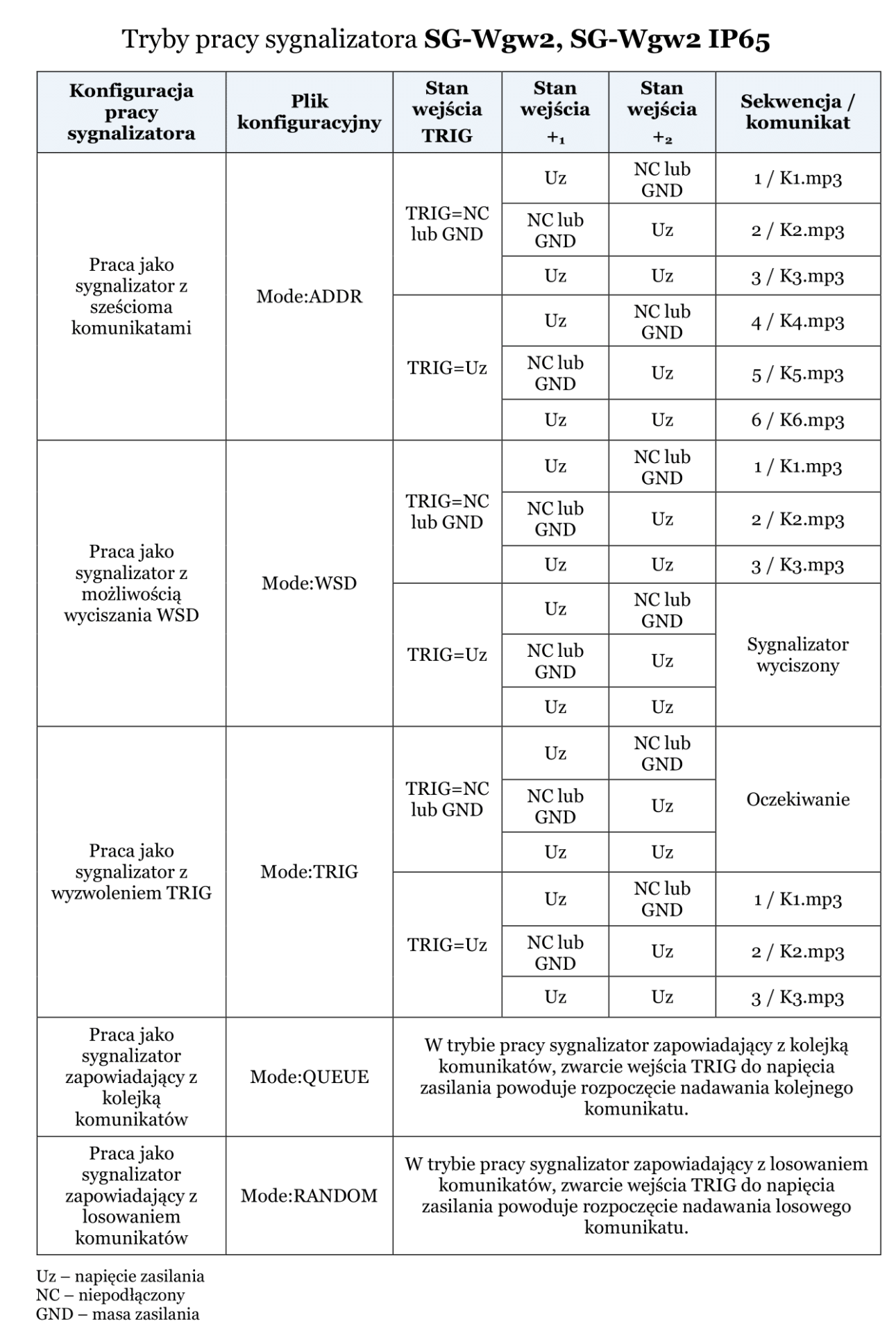 Dodatkowo użytkownik ma do dyspozycji wejście TRIG (aktywne po podaniu napięcia zasilania). W zależności od konfiguracji może ono pracować jako wejście: wyzwalające komunikat, wyciszające komunikat lub dodatkowe wejście adresowe. W przypadku liczby komunikatów od 1 do 3 wejście TRIG może pracować jako wejście wyzwalające lub wyciszające, natomiast w przypadku sześciu komunikatów wejście TRIG pracuje jako dodatkowe wejście adresowe. Wykorzystanie wejścia TRIG jako wejścia wyciszającego, stan aktywny na wejściu (chwilowe lub ciągłe zwarcie do napięcia zasilania) wycisza sygnalizator, jak również całą sieć podłączoną do niego.