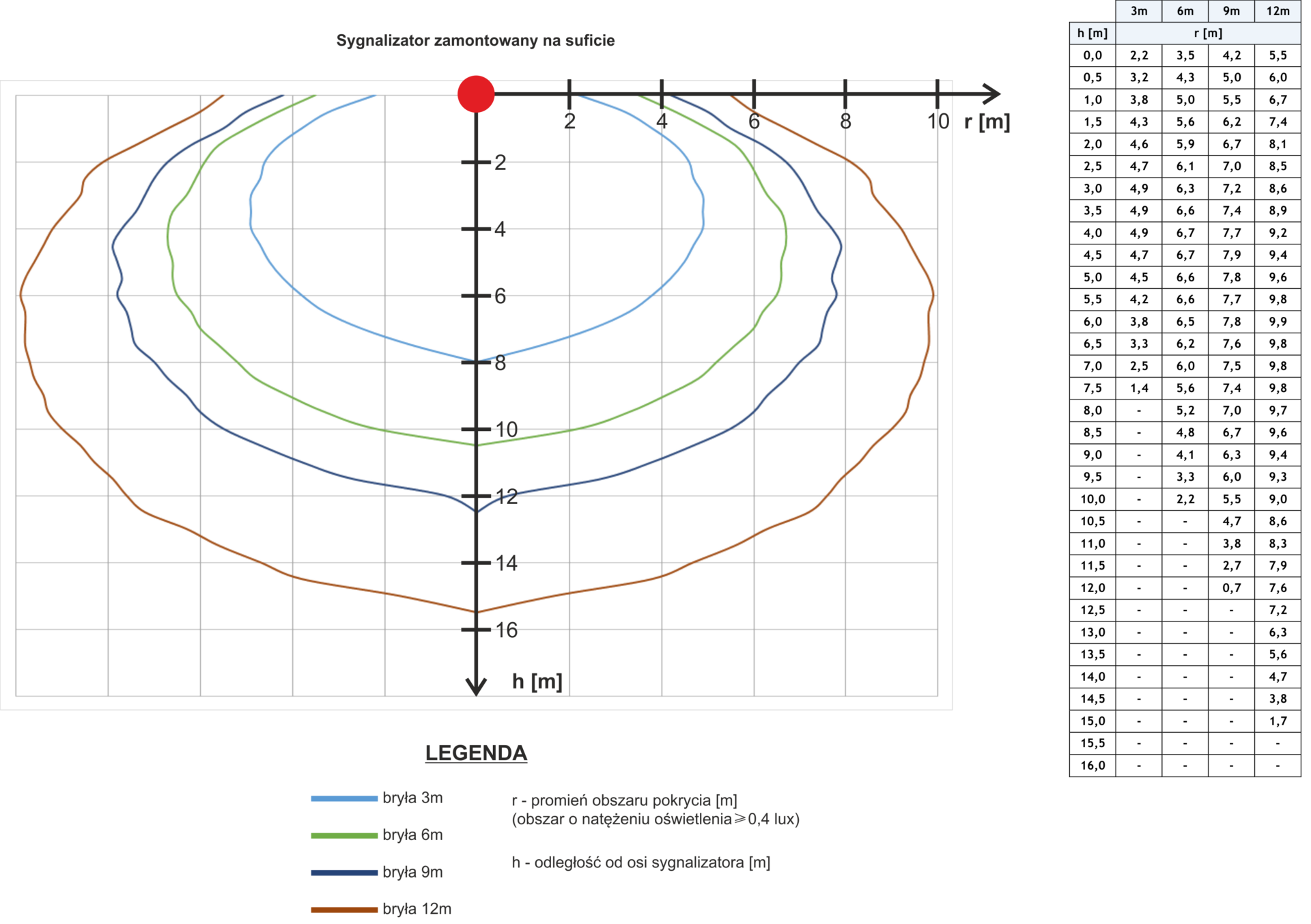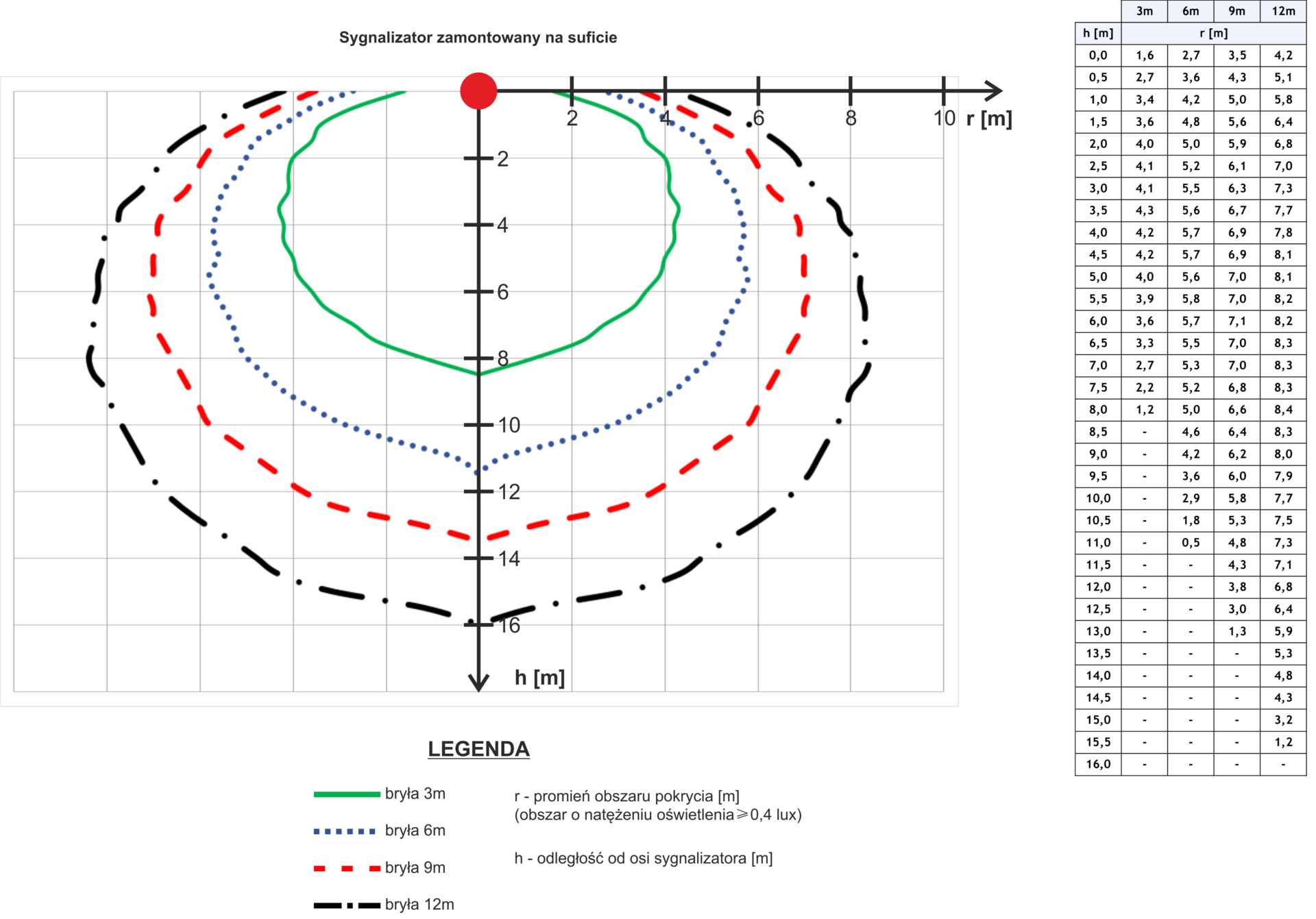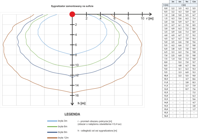 Na stronie W2 udostępnione są kształty brył fotometrycznych dla poszczególnych sygnalizatorów. W zależności od typu sygnalizatora oraz wysokości jego montażu zmienia się promień obszaru pokrycia (fragment przestrzeni, w którym osiąga się wymagane przez normę natężenie światła).