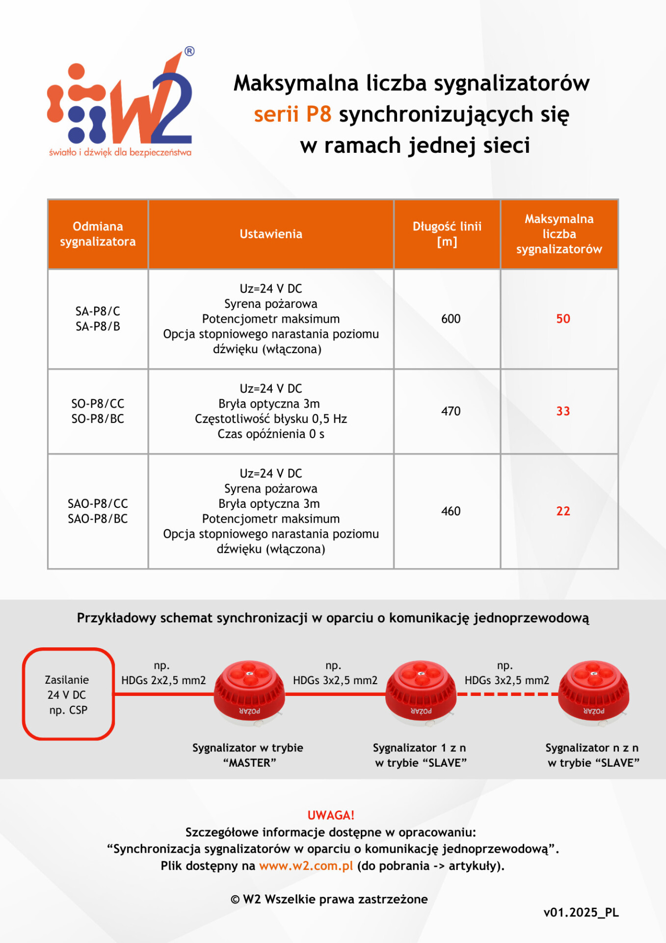 Certyfikowane sygnalizatory produkowane przez W2 posiadające certyfikowany człon optyczny są wyposażone w funkcję synchronizacji (SO-P8, SAO-P8, SGO-Pgw, SAOZ-Pk2, SGO-Pgz3).